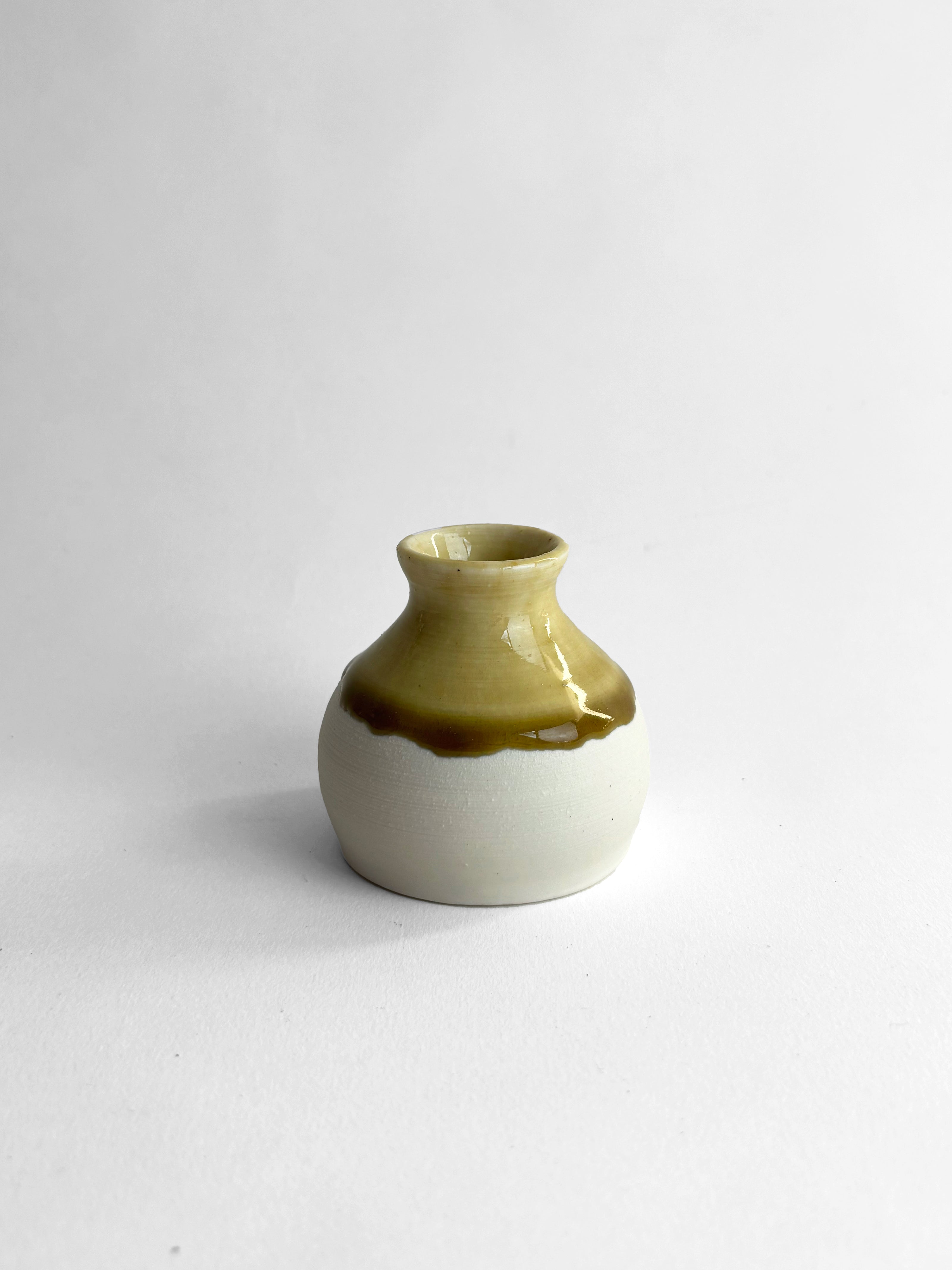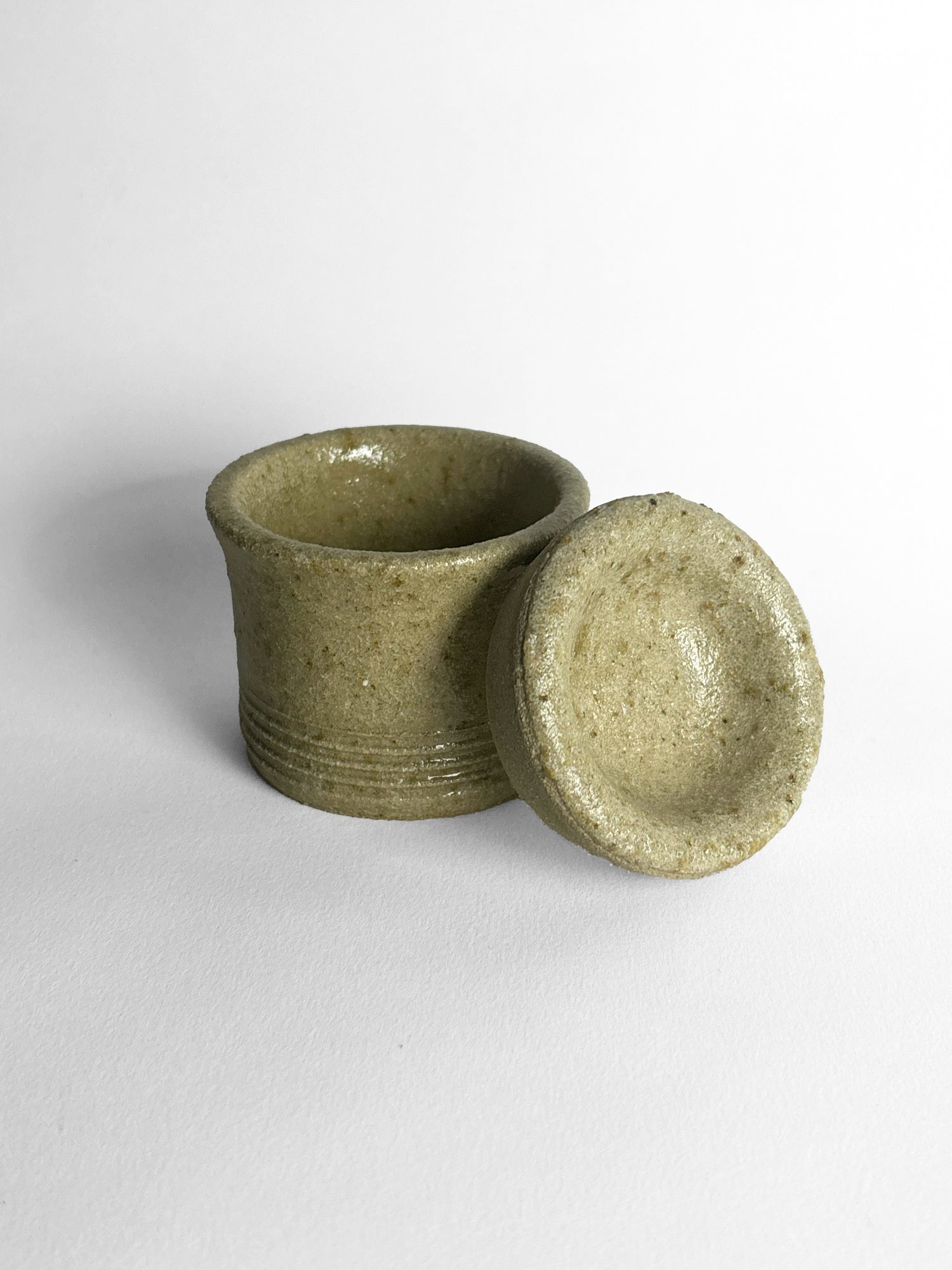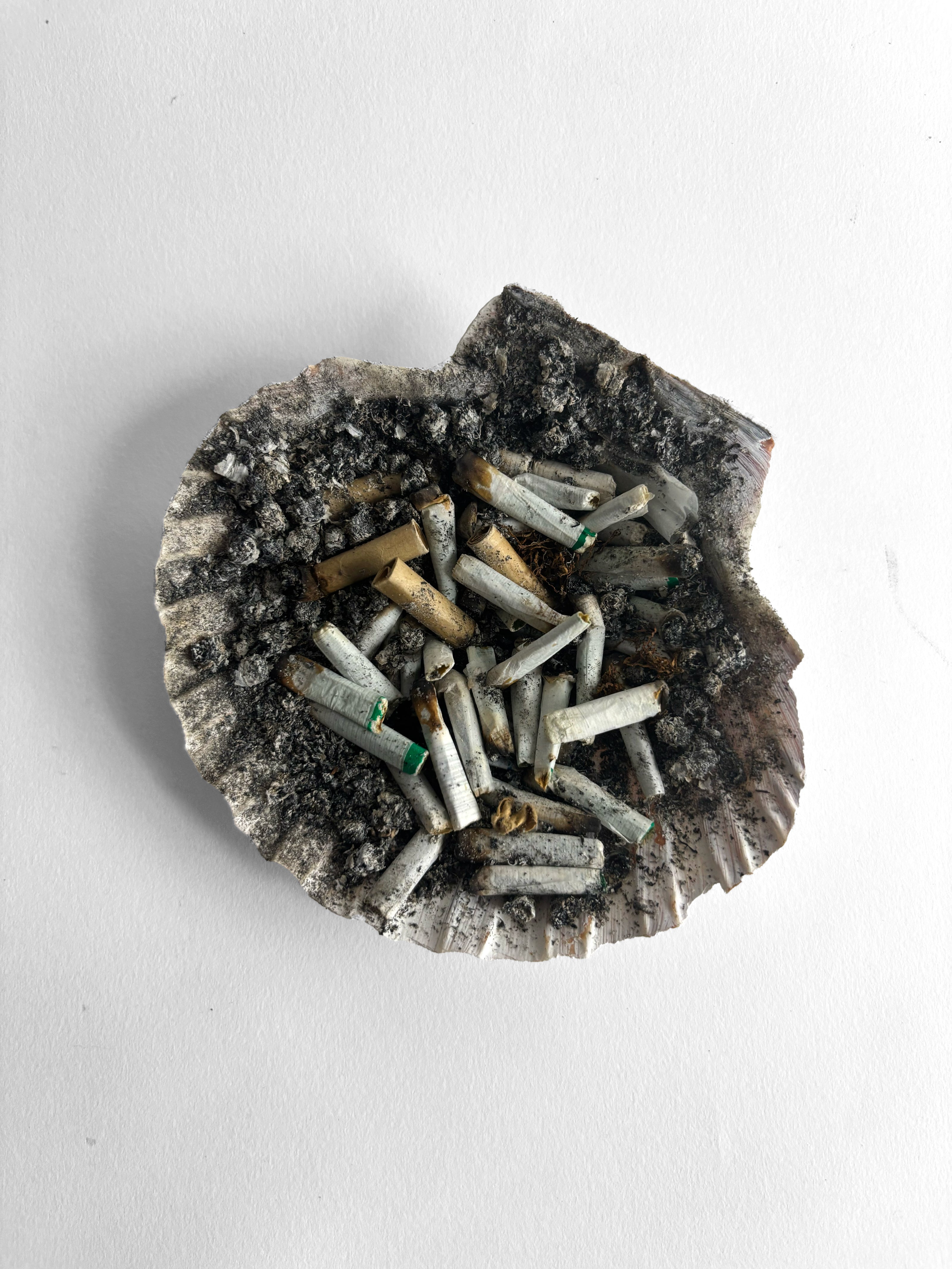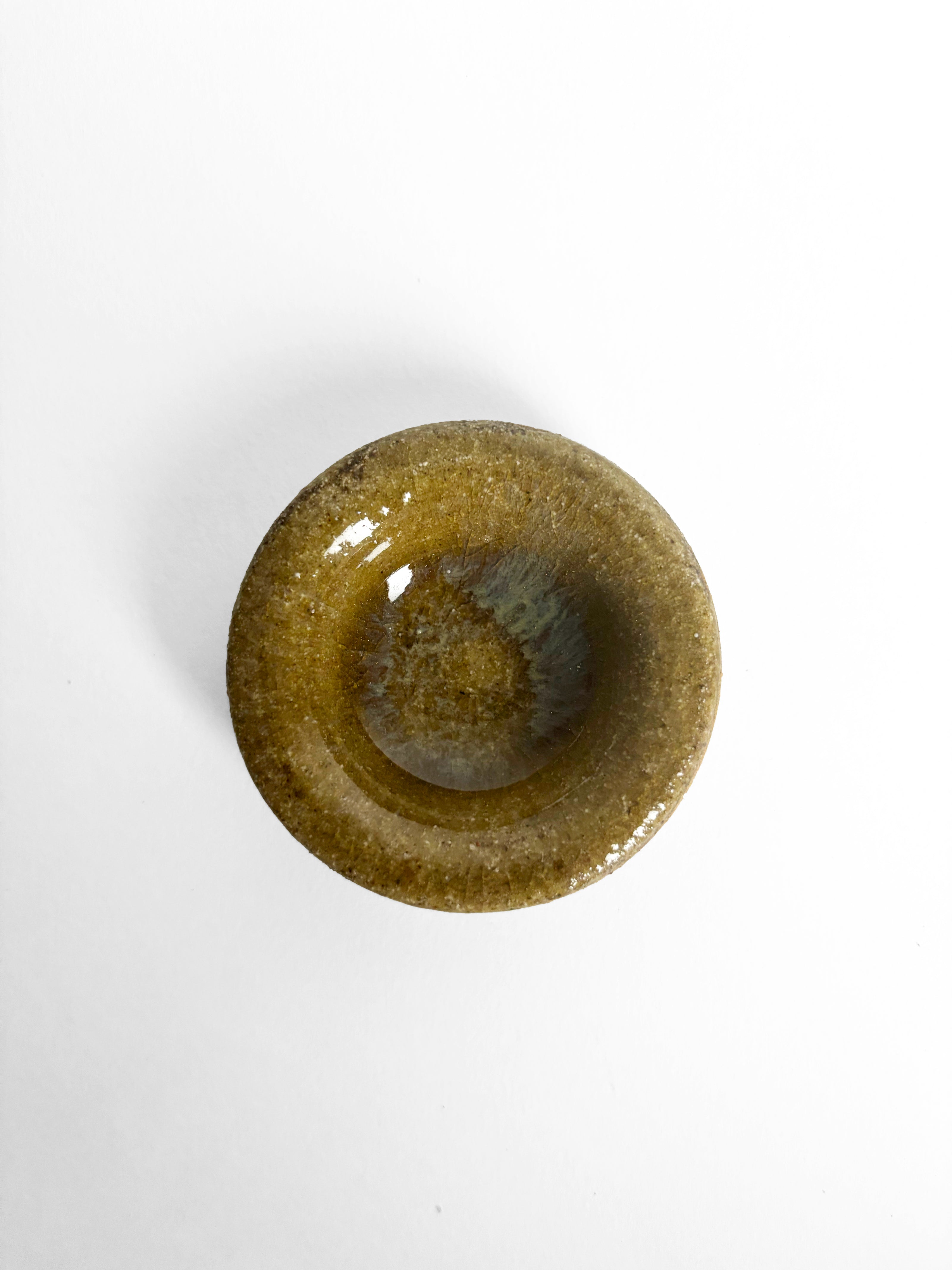 The glaze above is predominantly made from cigarette ash. Finding innovative ways to use waste materials is key to Neve Beill’s practice. The small pot showcases the glaze applied onto porcelain, whereas the test dish showcases the same glaze applied to sanded buff clay.