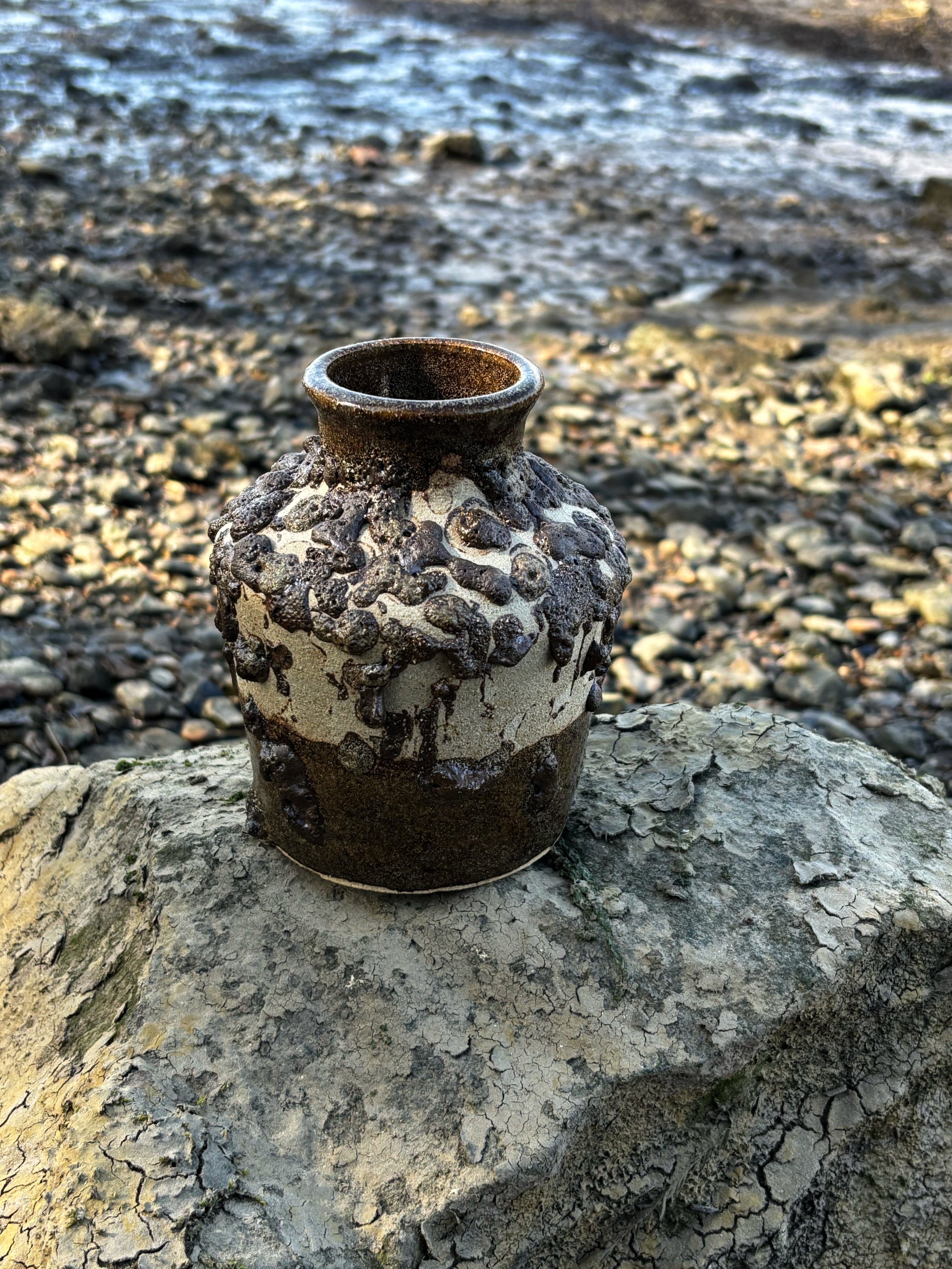 Ash glaze made using a combination of wild clay, ash from a fireplace and glass shards collected from the River Thames.