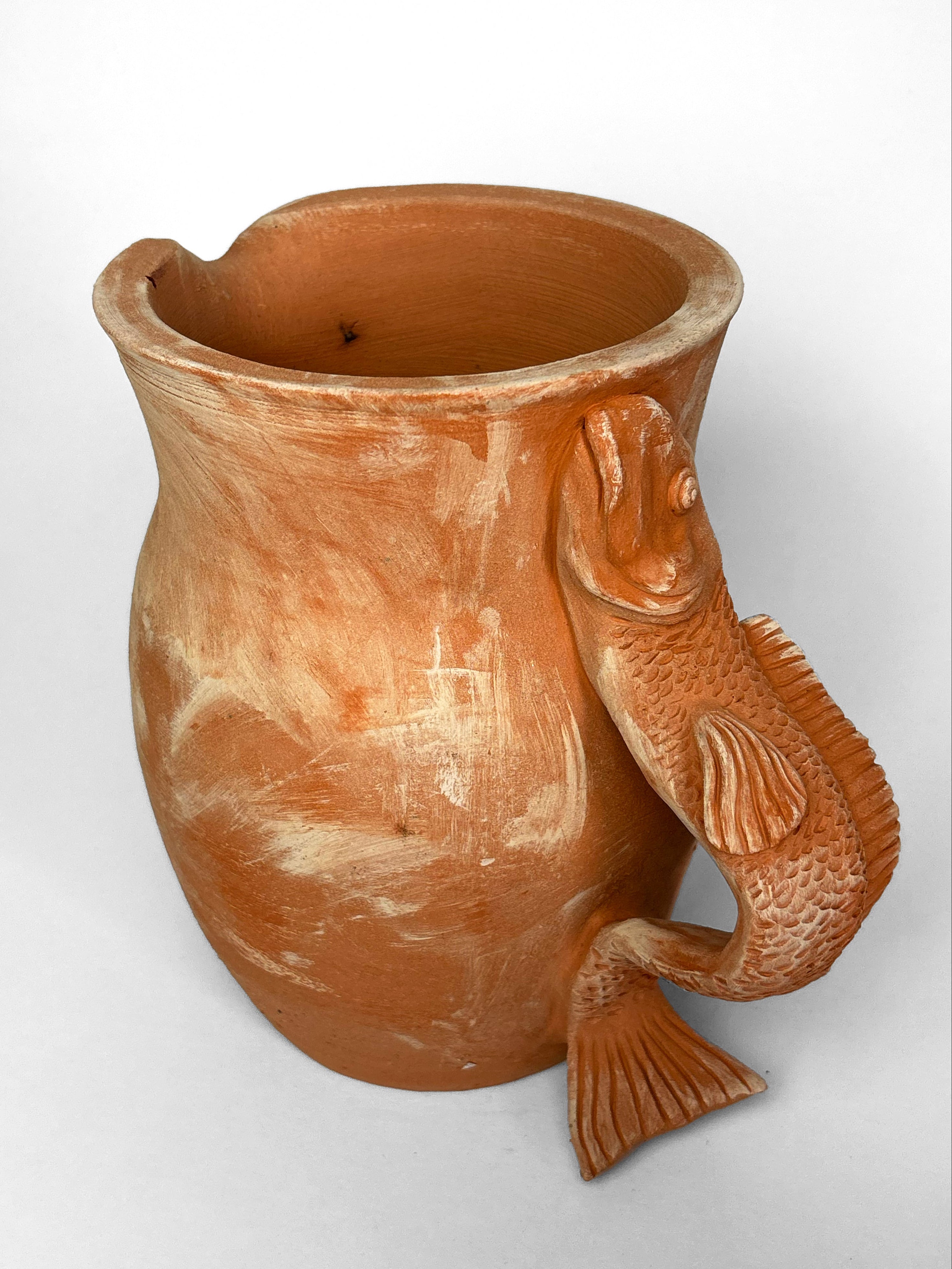 This large fish jug is made from wild clay found on Bembridge Beach, Isle of Wight. The clay alone is lacking in durability, to rectify this, grog materials have been added to improve the overall quality of the clay. These materials include sand stone and crushed Cuttlefish bone. This type of bone can be found on beaches all around the Island, due to being washed up with the tides.