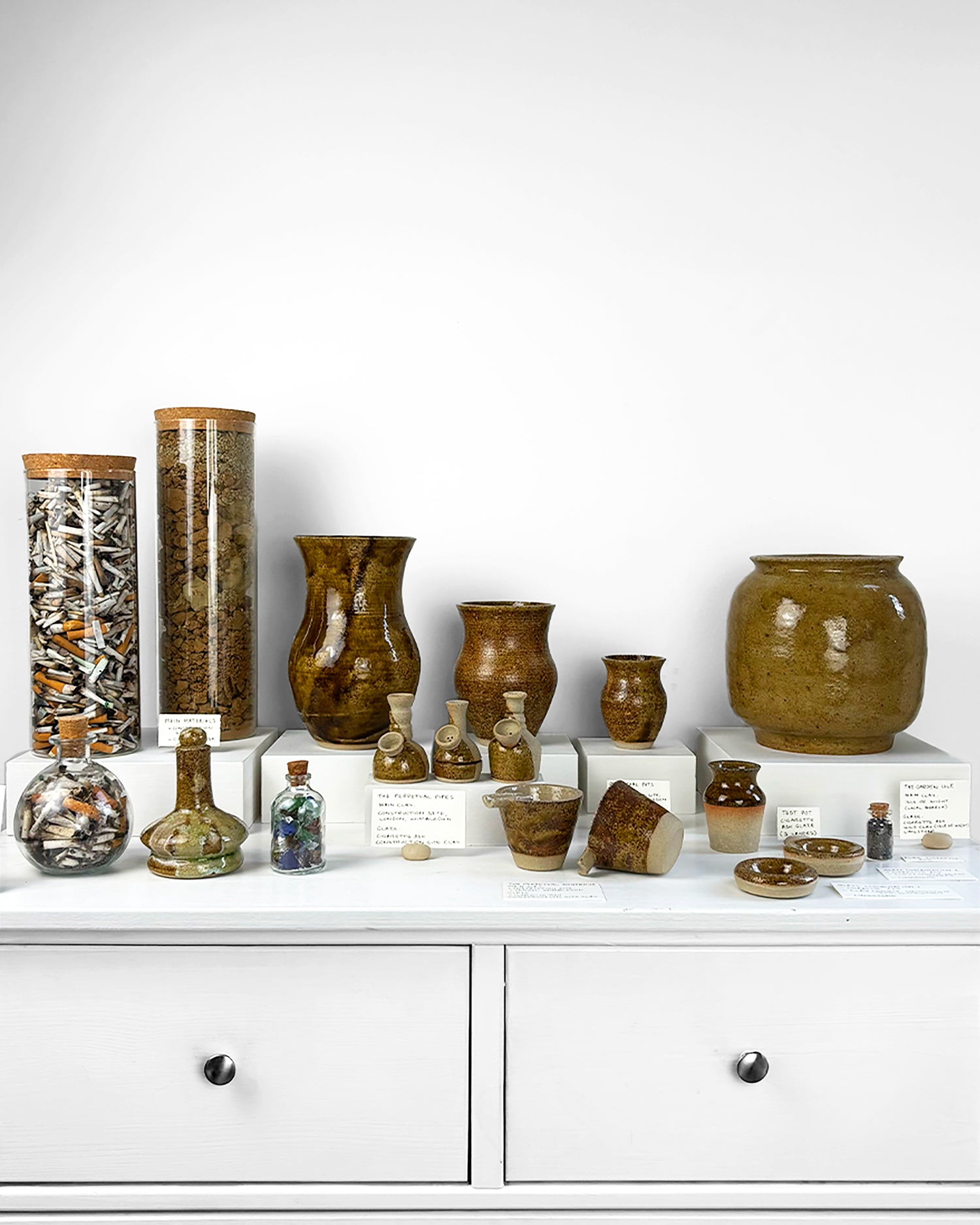 Two separate projects based around foraged materials collected along the coastline of the Isle of Wight. The, Isle of Vectis, features work inspired by Roman Pottery and specific location along the Island. Each piece has been glazed using natural ash glazes created from site specific materials. The Garden Isle features forms inspired by Isle of Wight folklore and local animals, each piece has been created from a different clay, sourced, along the island.