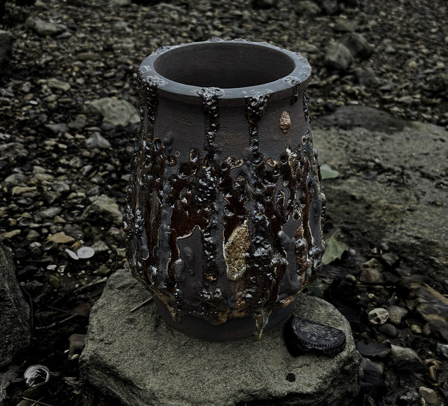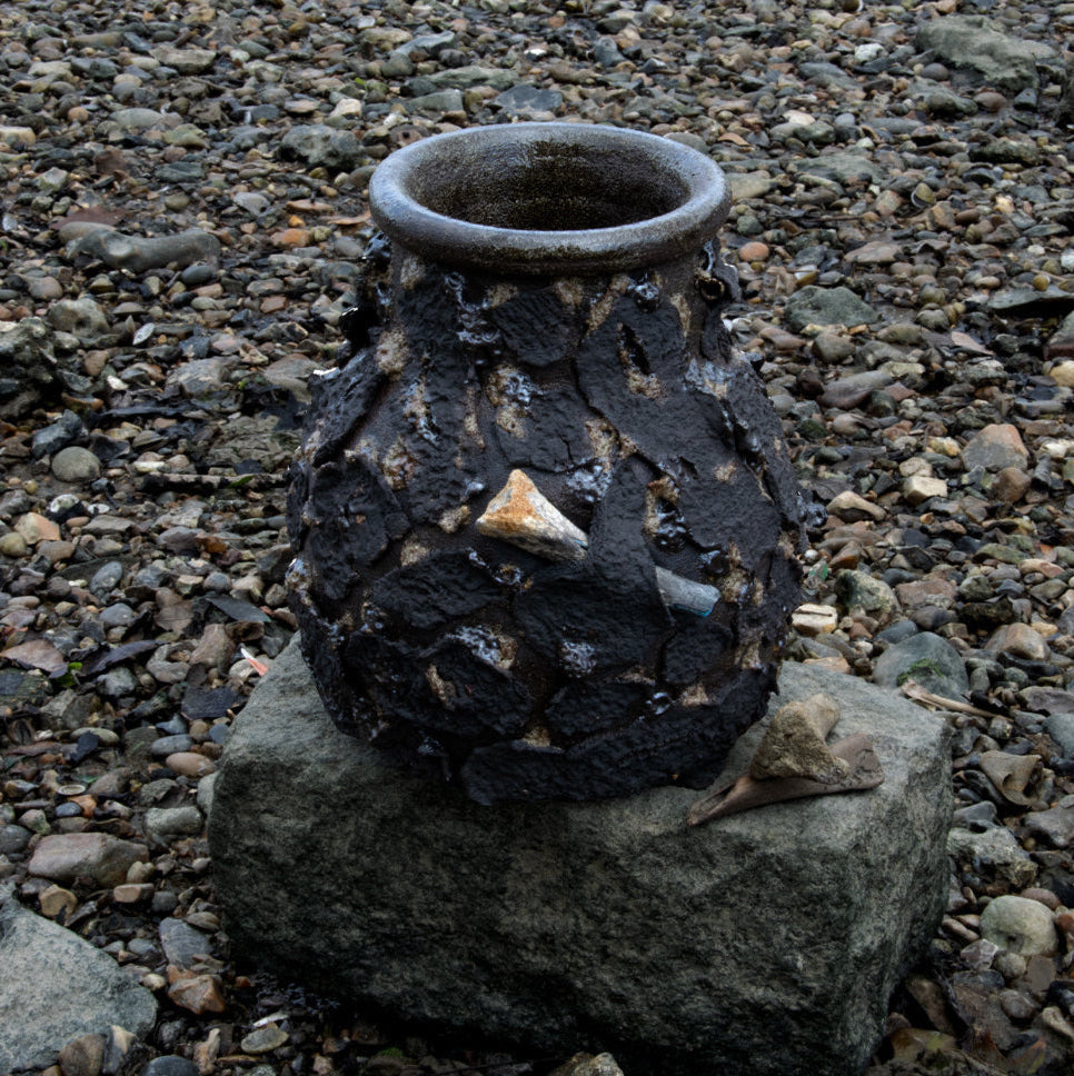 When mudlarking along the River's foreshore , I have consistently come across bones, presumably animal remains from the meat industry, discarded into the river over decades. I’ve been experimenting with various ways to repurpose this material.There’s something compelling about the mystery of found objects, and I wanted to capture that sense of the unknown in a pot that echoes the character of the Thames itself. The glaze on the inside of the pot, is a combination of wild clay from the River Banks, fireplace ash and crushed bones. The textural details is vitrified clay, sourced from various locations along the Thames. The final pot tells a story of what I observed, documented and learnt.