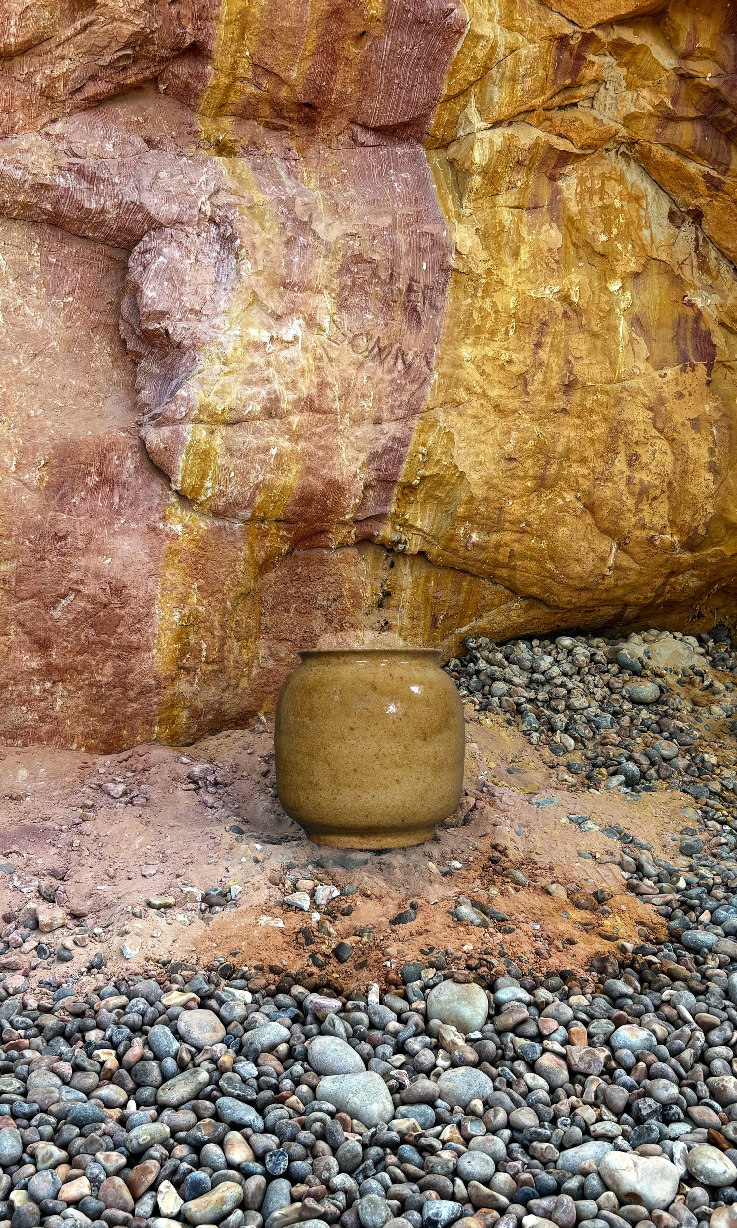 What fascinated me was how closely the glaze mirrored the vibrant tones of Alum Bay itself, a place known for its vivid, layered cliffs, especially the rich yellow hues of its rock formations. I knew immediately that this was the result I’d been searching for; it captured both the character of the clay and the essence of the landscape. To complete the process, I returned the final pot to Alum Bay, allowing me to see it in direct dialogue with its place of origin.