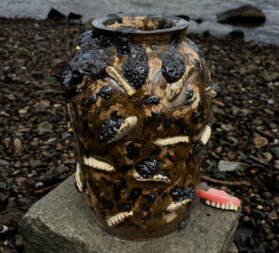 I created a mould of the dentures and embedded them into the surface of one of my pots, fusing them with vitrified Thames clay in an attempt to reflect how I found them, gleaming in the thick, black mud. One of my main aims with this project was to incorporate found objects and evoke a strong sense of place. This particular piece captures both goals in a way that was entirely unexpected, yet deeply resonant.